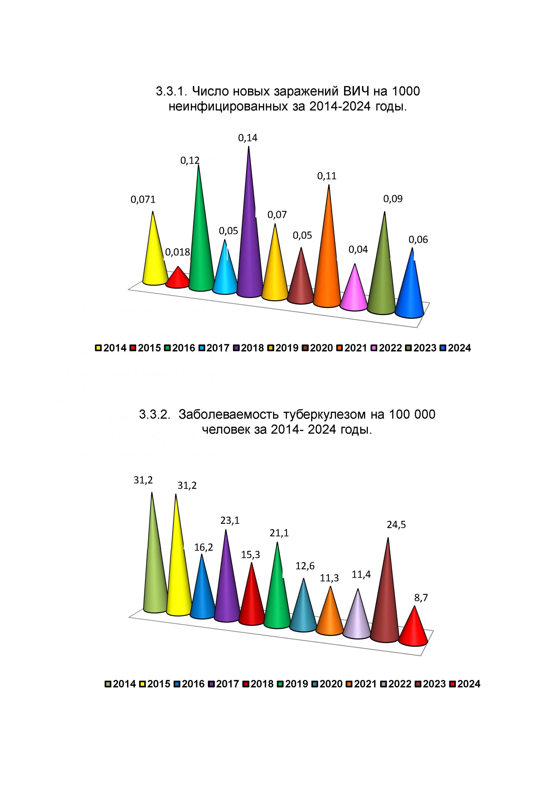 3.3.2. Заболеваемость туберкулезом на 100000 человек | 21,50 | 20,43 | 19,21 | 11,8 | 14,9 | 14,6 | 10,6 | 21,1 | 11,4 | 24,54 | 8,78 |