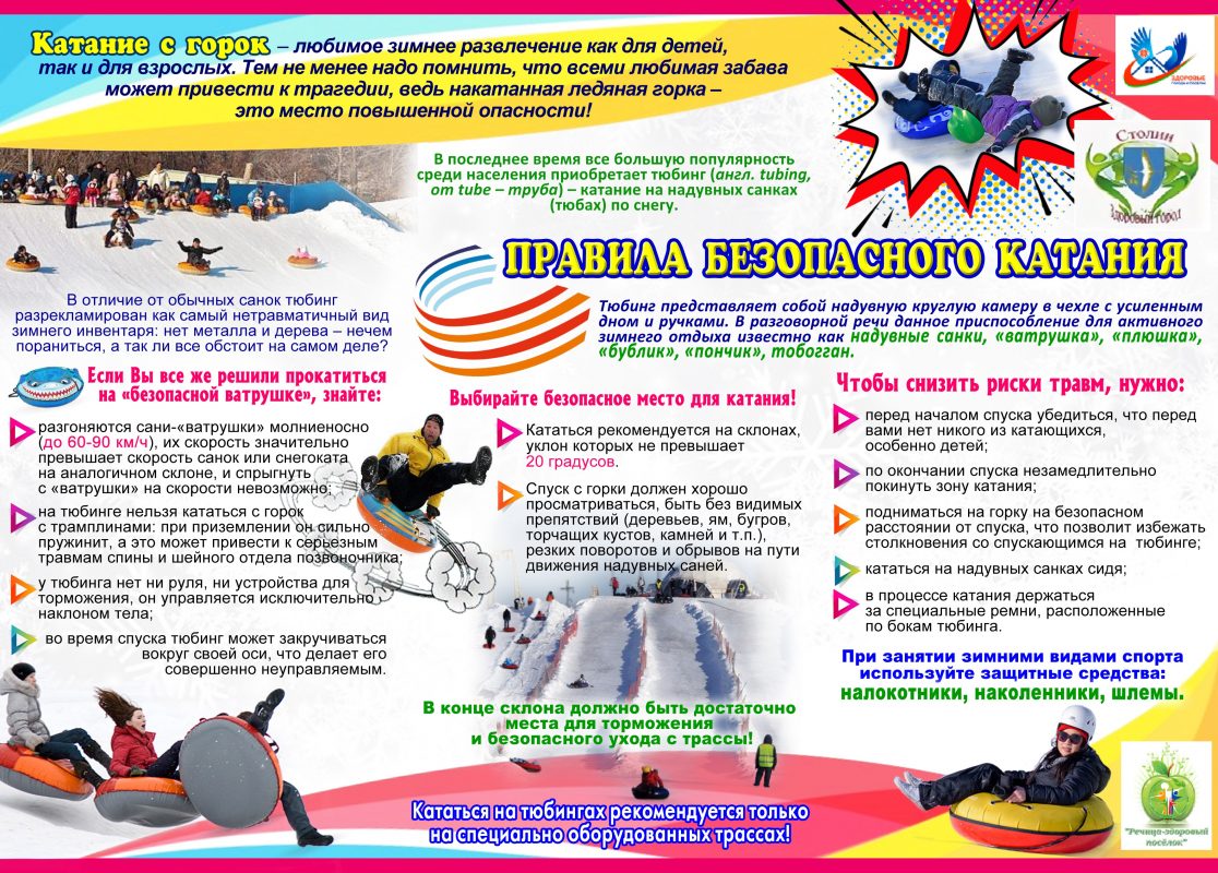 Особую опасность в последнее время создаёт нарастающая популярность среди населения катания на надувных санках на снегу («Тюбинг»). Предлагаем Вам ознакомиться с памятками безопасного поведения на скользкой дороге и правилами безопасного катания.