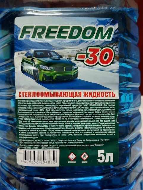 низкозамерзающая стеклоомывающая жидкость «FREEDOM» — 30, в ПЭТ-бутылках объемом по 5 л, состав: вода деминерализованная более 30%, спирт изопропиловый более 30%, НПАВ менее 5%; краситель менее 5%, ароматизатор менее 5%, дата изготовления 01.08. 2025, номер партии – 9, срок годности 3 года, штрих-код 4 609256 897882, изготовленная согласно ТУ 20.41.32-001-79513122-2024, ООО «МЕГАПОЛИС», 170027, Россия, Тверская область, г. Тверь, ул. Лермонтова, д. 17а, офис 6. Адрес производства: 153032 Россия, Ивановская область, г. Иваново, ул. Станкостроителей, 1, не соответствует требованиям пункта 5.8 «Единых санитарно-эпидемиологических и гигиенических требований к товарам, подлежащим санитарно-эпидемиологическому надзору (контролю)», утвержденных Решением Комиссии Таможенного союза от 28.05.2010 № 299, главы II, раздела 5 (п. 5.8, таб.1 прил. 5 А); Гигиенического норматива «Содержание метанола в низкозамерзающих стеклоомывающих и антиобледенительных жидкостях», утвержденного постановлением Совета Министров Республики Беларусь от 25.01.2021 № 37 (в редакции постановления Совета Министров Республики Беларусь от 29.11.2022 № 829) по показателю безопасности «содержание метанола»: фактическое содержание – 20,24±2,83 об.%, при нормированном значении — не > 0,05 об.% (превышение в 404,8 раза).
