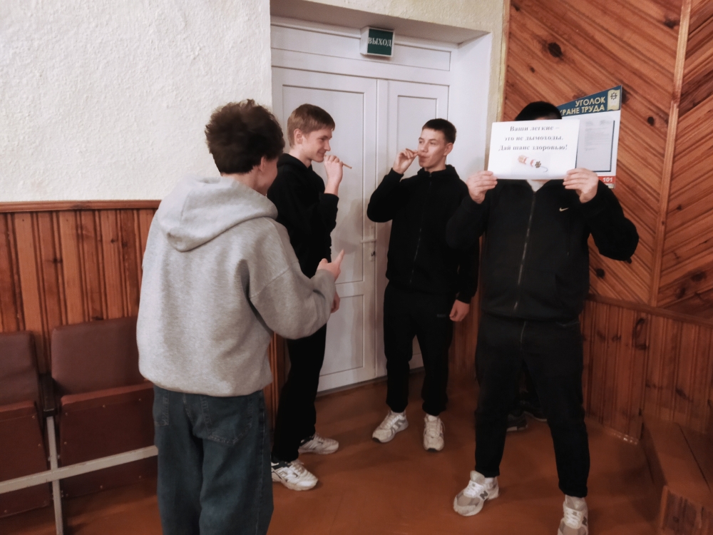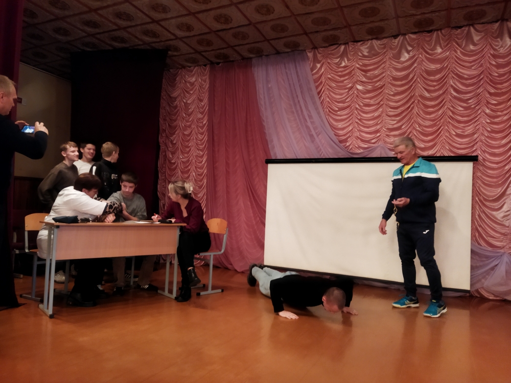 Специалистом отделения общественного здоровья Столинского районного ЦГиЭ Мойсиевич Т.В., с участием всех присутствующих, была организована информационно-образовательная квест-игра (пройди 4 испытания и покажи свои возможности). От групп 2-го курса выступили 4 команды. Зал был разделён на интерактивные территории: «Медицинскую», «Законодательную», «Спортивную», «Актерскую» и аудиторию болельщиков. Участникам предстояло проявить себя в спортивной подготовке, показать свои знания по указанным направлениям в области влияния курения и «парения» на здоровье и жизнь человека, знание законодательства Республики Беларусь, а также проявить смекалку в создании антирекламы курения подростков. Ребята активно и достойно показали свои знания и смекалку.