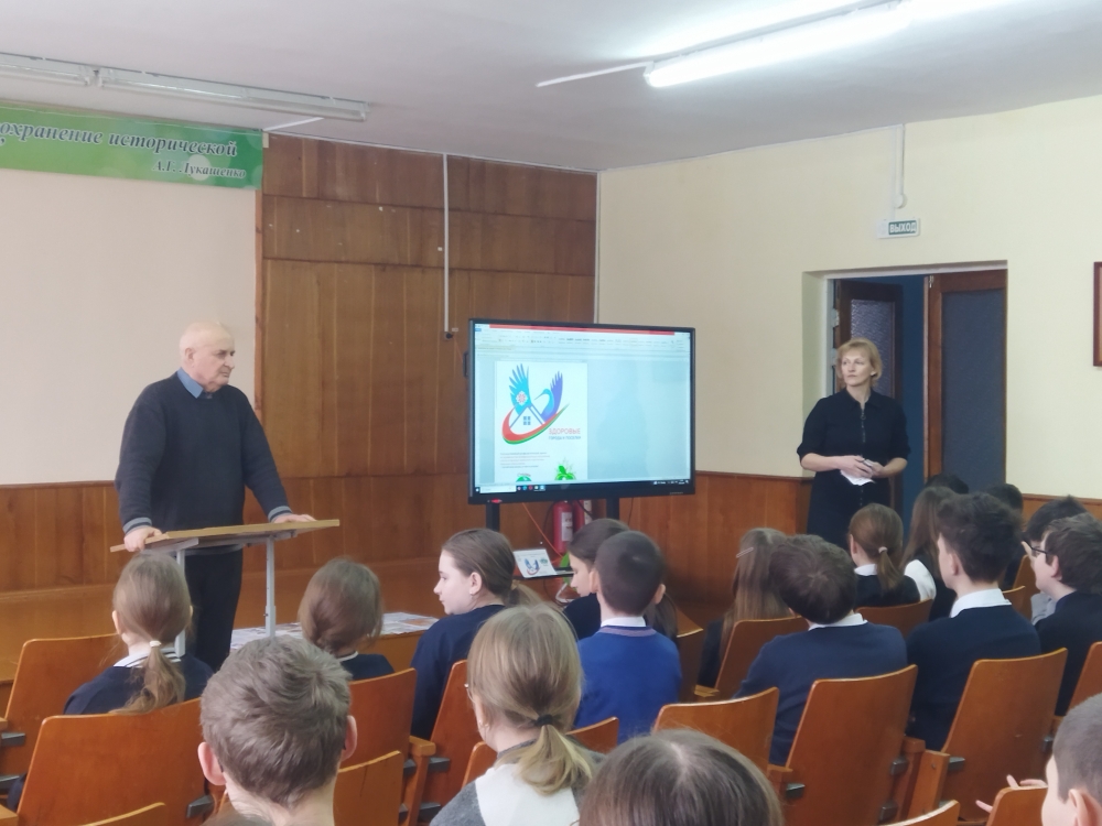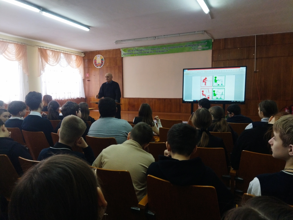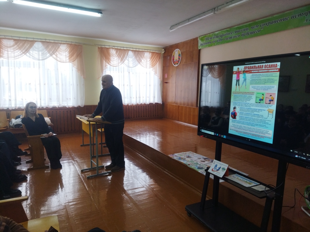 Корчевский Г.И. – в рамках проекта «Правильная осанка – залог здоровья!» говорил о влиянии искривления осанки на организм человека, о причинах возникновения и профилактике возникновения заболеваний осанки, выполнении правил использования рюкзака, парты и конторки, поведения за партой, выборе обуви, положении подушки, ведении подвижного образа жизни и занятия физкультурой;